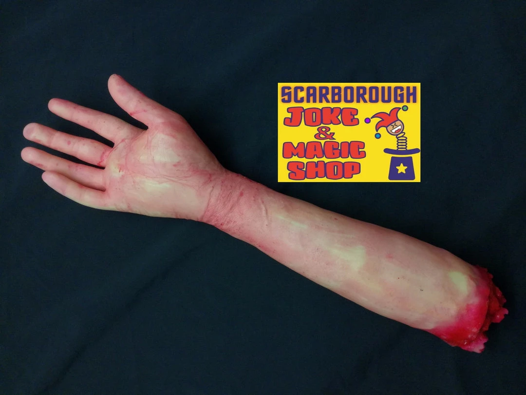 Featuring a life sized false severed arm with hand painted gory details and a horrible squidgy texture!
