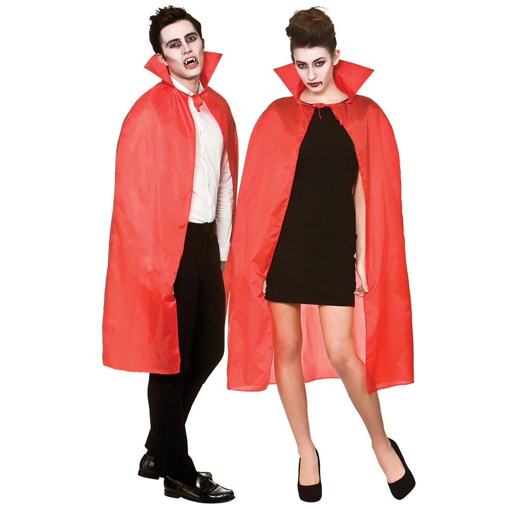 Unisex long, red cape with tie fastening at the throat and large, stand-up collar.